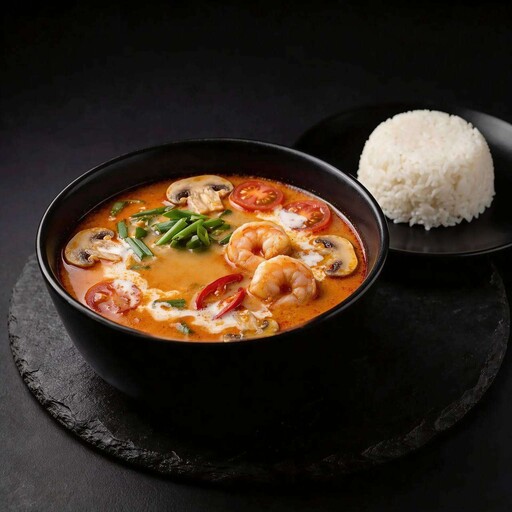 Бульон, кокосовое молоко, креветка, шампиньоны, черри, лук зелёный, паста Том Ям, перец чили, рис. *Внешний вид блюда может отличаться от фото на сайте