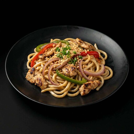 Куриное филе, лук красный, перец болгарский, арахис, удон, соус устричный, чеснок, кунжутное масло. *Внешний вид блюда может отличаться от фото на сайте